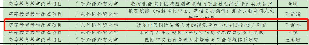 又讯,近日,广东省教育厅公布了2024年度广东省本科高校教学质量与教学改革工程建设项目立项名单,王雪晔老师申报项目《读图时代国际传播人才的视觉素养与批判思维提升研究》获批省级高等教育教学改革项目。