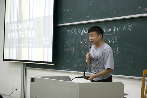 广告1201的主讲人郑同学上台后借工作人员服装上的小贱鸡图案引出了他们班团日活动的主题:“我们的青春不散场”。本次团日活动中,他们班组织到西冲出游,“大家从平时的拘束变得狂放”,生动的讲述引起台下阵阵笑声。他讲到:“大三了,可以疯狂就疯狂下吧。”