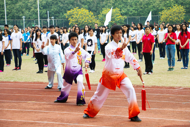 校运会的开幕式表演同样充满了运动的激情与活力,首先出场的就是广外广袤园武术协会。剑、刀、棍、枪等武学器械的精彩武术表演博得了现场观众的阵阵喝彩,让人领略了中华武术的博大精深之余,也展现了广外人的昂扬向上的精神风貌。