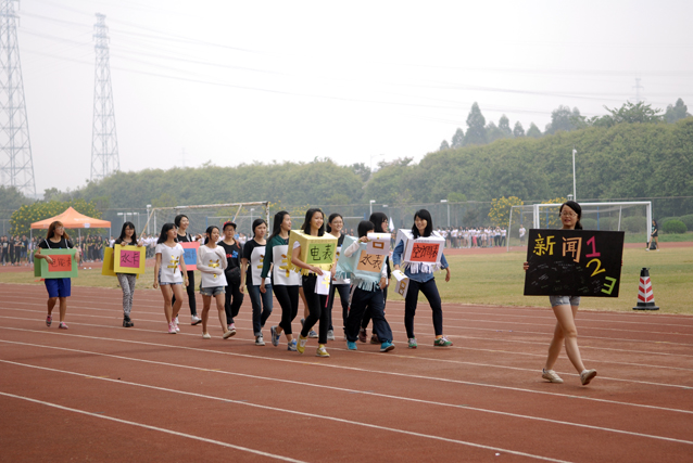 事实上,进场仪式中不仅有还有新闻1303班的呼吁抛开手机,莫要过度依赖的概念概念;也有伴随当TFBOYS 《青春修炼手册》热舞的新闻1301班;以及伴随着网络流行神曲“我的滑板鞋时尚时尚最时尚,回家的路上,我情不自禁,摩擦,摩擦。”音乐起舞的播主1301班。诸如此类或热点、或流行的元素都被揉进进场仪式中,可谓异彩纷呈,充满个性。