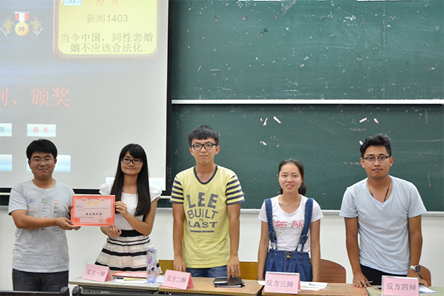 本次辩论赛季军赛以“当今中国,同性恋婚姻是否应该合法化”为主题,各环节中选手彼此间展开了激烈地交锋。经过激烈对决后,正方广告1401班得到了季军的宝座,同时,来自反方新闻1403班的林婉津同学凭借出色的表现成为了本场比赛中的“最佳辩手”。
