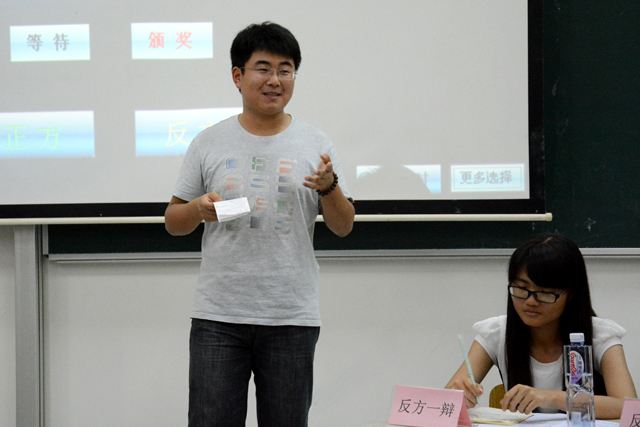 紧接着进入盘问阶段。开始正方就向反方单刀直入地提出:“为什么不支持当今中国同性恋婚姻合法化?”反方接过问题后,镇定沉稳,摆出具体数据以及来自美国马萨诸塞州的真实事例证明同性恋合法化对社会的危害以及阻碍人类社会进步的进程这一观点,有力地反驳了对方。正方也不甘示弱,回应道:“立法只是一个保障,它并不代表要强迫群众马上接受同性恋,这是一个渐变的过程。”一问一答,你来我往,比赛迅速进入了第一轮高潮。