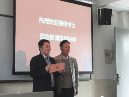 讲座正式开始前,何国平介绍了出席讲座各位嘉宾并详细介绍了魏伟博士的就学、就职经历,让参加讲座的同学更了解魏伟博士。之后,杨魁院长代表学校赠与魏伟博士礼物,魏伟博士也把两本亲笔著作赠与现场提问的同学。