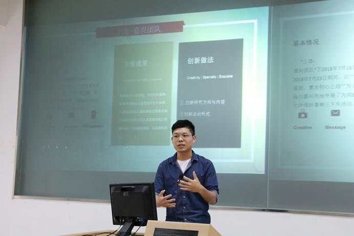 首先,梅州广播电视台、河源龙川浮石小学、广州天河黄村等三支社会实践队伍汇报。梅州“新传新语”服务队分为留台组、汉剧组和足球组。留台组组员深入梅州广播电视台,学习录音和节目制作;汉剧组带大家了解了梅州的汉剧风采;足球组对被视为“足球之乡”的梅州调研了足球发展情况。