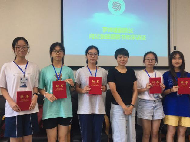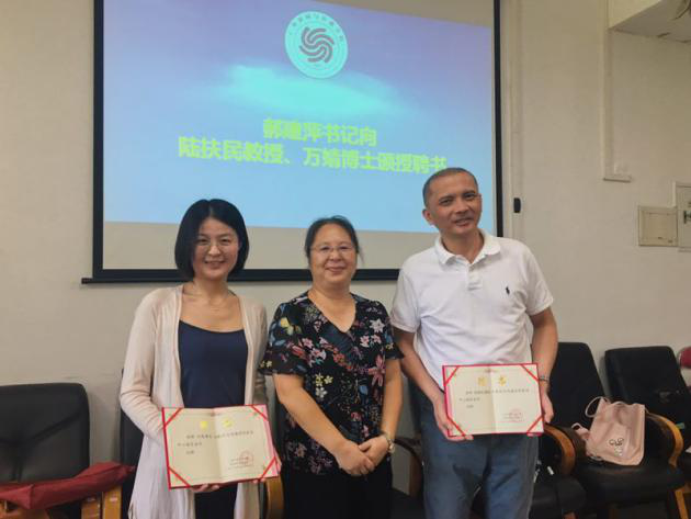 郝建萍书记为陆扶民教授、万婧博士颁发聘书 罗坤瑾副院长为干事颁发聘书及记者证