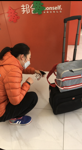 黄谦在为艺考生的行李消毒