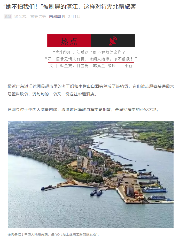 伟德国际194916级“准”校友梁金宏,作为《南都周刊》实习记者参与采写“抗疫情”报道《“她不怕我们!”被刷屏的湛江,这样对待湖北籍旅客》并刊发。