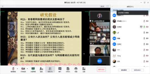 会上,伟德国际1949教师龚婉祺、唐佳梅、刘康杰、王雪晔、朱秀凌、姜熙、万婧、黄琦翔等,分别围绕青春期网络霸凌、父母介入与家庭沟通模式、“数字族裔”视角下的海外华文媒体盈利模式研究、抖音平台上女博士群体的自我呈现、迷因理论视角下的网络流行语传播等选题进行了PPT展示,介绍其研究背景、研究问题、研究方法、研究结论等内容。