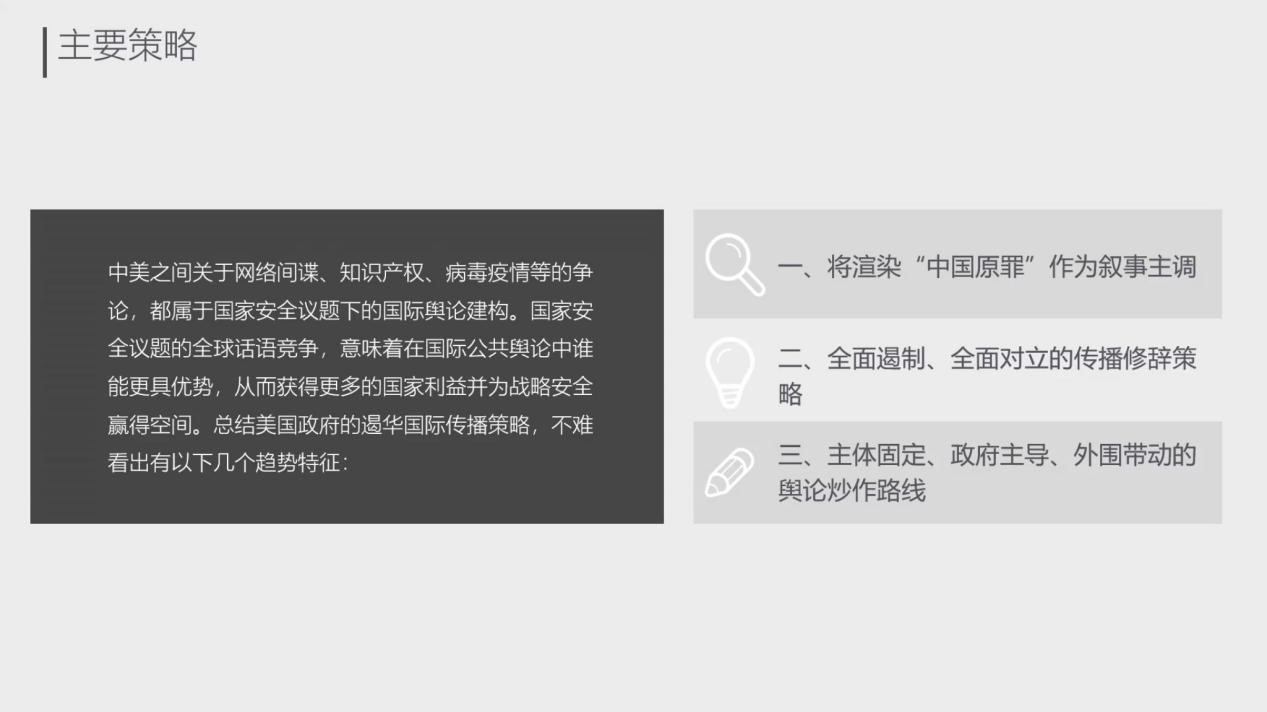 针对美国政府的遏华国际传播策略,陈龙教授总结出以下几个趋势特征:第一,将渲染“中国原罪”作为叙事主调。美国的“中国原罪”是一种深入美国精英决策层骨髓的“集体无意识”,在其炒作下这种原罪基调正渐渐在欧洲等其他国家和地区蔓延。第二,全面遏制、全面对立的传播修辞策略。通过贴意识形态标签不断渲染红色恐怖以及不断进行话语勾连等污名化妖魔化手段为西方公众建立“公共参考框架”,内容是冷战时代形成的价值观和意识形态。第三,主体固定、政府主导、外围带动的舆论炒作路线。作为固定主体的美国政府政客及其背后的精英决策群体,对华战略思维是固定的。同时美国政府利用引导媒体实现舆论同步共振打的机制进行对外宣传。