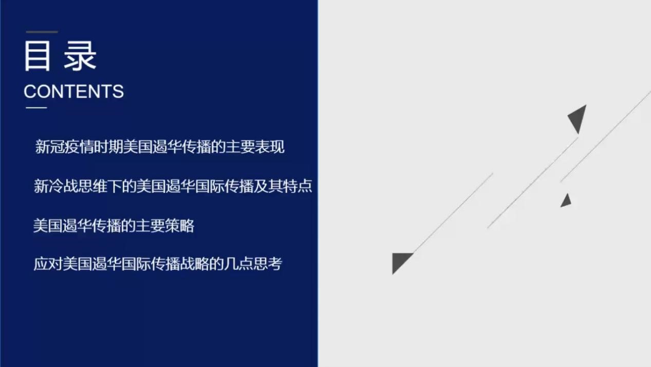 本次讲座陈龙教授主要围绕四个方面进行解读:一是新冠疫情时期美国遏华传播的主要表现;二是新冷战思维下的美国遏华国际传播及其特点;三是美国遏华传播的主要策略;四是应对美国遏华国际传播战略的几点思考。