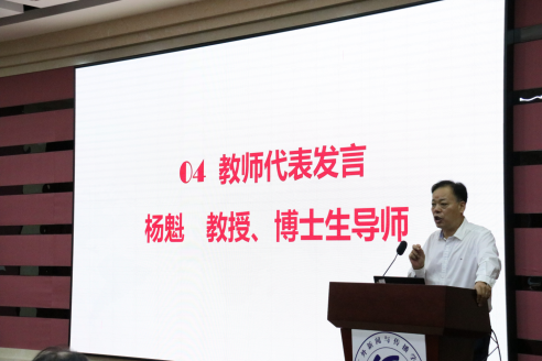 教师代表杨魁教授发言,从不同角度阐述了当今社会对优秀新闻传播人才的需求。他嘱咐同学们在大学期间要不断打磨自己,做好自己的人生定位,“不负韶华,不负使命,成就自我。同时,杨魁阐释了“大学精神”的深刻内涵:“大学精神”更在于分享、传承、创造,以及心系他人、心系社会的“人文关怀”,这样才能有持久的快乐和体验。帮助同学们对于大学有了新的认识与体悟。