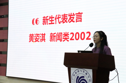 新闻传播学类2002班黄姿淇同学作为新生代表,发言时讲述了入学以来的体会与感想。广外的国际化办学特色与浓厚的学术氛围令她兴奋与好奇,校训“明德尚行,学贯中西”也给予了她诸多启发和鼓舞。
