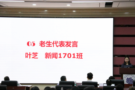 新闻1701班叶芝发言。她向师弟师妹们分享了入学三年以来的感受。她说到,伟德国际1949是一个大家庭,是空间共同体、情感共同体也是发展共同体,希望师弟师妹们尽早在这里找到存在感、归属感、幸福感,融入新传大家庭。