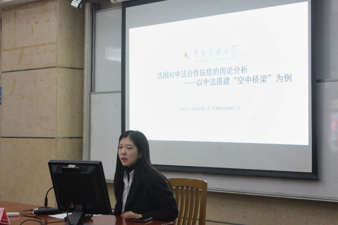 中国传媒大学传播研究院阎庆宜同学发表《法国对中法合作抗疫的舆论分析——以中法搭建“空中桥梁”为例》的主题演讲。她以法国为研究对象 ,以“空中桥梁”为研究样本,通过内容分析及话语分析,从政府、媒体、民众三个舆论场出发,探讨中法搭建抗疫“空中桥梁”的舆论影响。研究发现,在政府舆论场中,法国政府对该事件的态度复杂,积极与消极并存;在媒体舆论场中,法国媒体的态度较为中立,焦点在于中法抗疫合作;而在民间舆论场中,以推特网民评论数据为例,他们更加关注对法国的影响而非中国或其他国家,总体态度较为负面。阎庆宜同学提出了三个反思点,分别为国际合作的行为规范化、传播分众化以及宣传去政治化。
