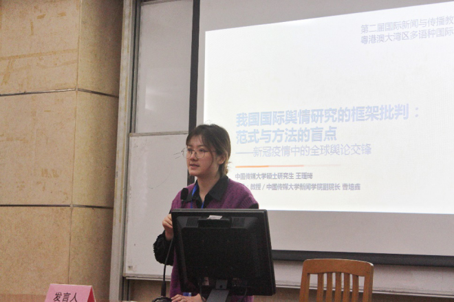 中国传媒大学电视学院的王瑶琦同学带来主题为《我国国际舆情研究的框架批判:范式与方法的盲点——新冠疫情中的全球舆论交锋》的演讲。她对目前研究国际舆情的中文文章做了概括性的综述,从中分析目前中国舆情研究存在的盲点和问题,并对未来的改进空间进行反思。通过国际舆情研究的范式与方法,以疫情为引入点,探讨我国国际舆情研究面临的三个挑战:局限于文本内容分析、研究范式固化以及运用单一的研究方法。对此,她提出要扩大反思范围、做不仅仅局限于大国的舆情研究、拓展诸如民意访谈和问卷调查的研究方法。同时要关注西方主导的民意调查机构一统天下的表达现状以及研究视野从静态的文本分析扩大到动态的生产范式类研究。