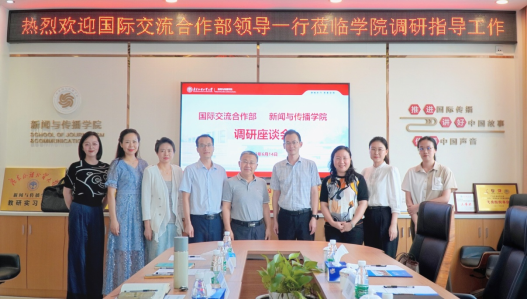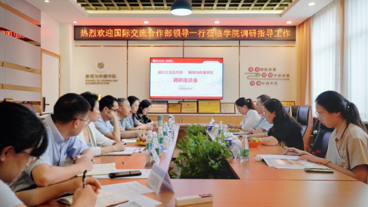 侯迎忠代表学院对国际交流合作部一行的到来表示热烈欢迎。侯迎忠从国际交流合作项目、教学科研国际化、师资队伍国际化以及国际化人才培养等方面介绍了近年来学院国际化建设工作所取得的一些成绩。侯迎忠表示,学院强化国际化人才培养模式改革与创新,开办全媒体国际传播本科创新班和“多语种+国际新闻传播”硕士创新班,与美国密苏里大学、英国利兹大学、英国伦敦大学、澳洲西悉尼大学、香港浸会大学、台湾世新大学等国境外知名高校保持密切合作,开展本科交换生、本科双学位、硕士双学位培养项目、研究生短期访学、暑期学校等学生交流交换项目。侯迎忠还介绍了学院近期与澳门科技大学、香港浸会大学、香港恒生大学等境外高校的交流情况。