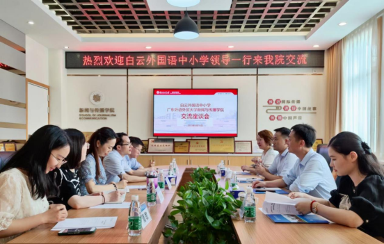 包生耿主持座谈会,他代表学院对白云外国语中小学一行的到来表示热烈欢迎。介绍了学院在党建思政、学科建设、人才培养、教学科研、国际合作与交流、实习实践等方面的基本情况。他表示,学院秉持“专业+外语+全媒体技能”的学科融合发展理念,培养了一批批优秀的国际新闻传播人才,希望发挥双方各自优势,深化在人才培养、教学研究、实习实践等方面的合作和交流,为广外基础教育赋能,为推进学校教育事业高质量发展作出积极贡献。