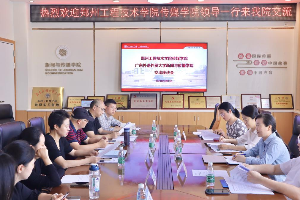 罗坤瑾对郑州工程技术学院传媒学院一行的到来表示热烈欢迎,介绍了广外的基本情况以及学院在人才培养、学科建设、科学研究、社会服务、国际合作等方面的情况。罗坤瑾表示郑州职业技术学院传媒学院重视实践教学,在专业实践方面具有很多优秀的经验和做法,不断探索实施项目化教学,尤其是传媒学院全方位立体式“工作室制”的特色实践教学模式,能够培养学生的专业实践能力,。希望未来两院能继续深入交流,加强合作。