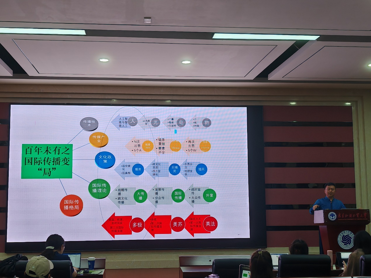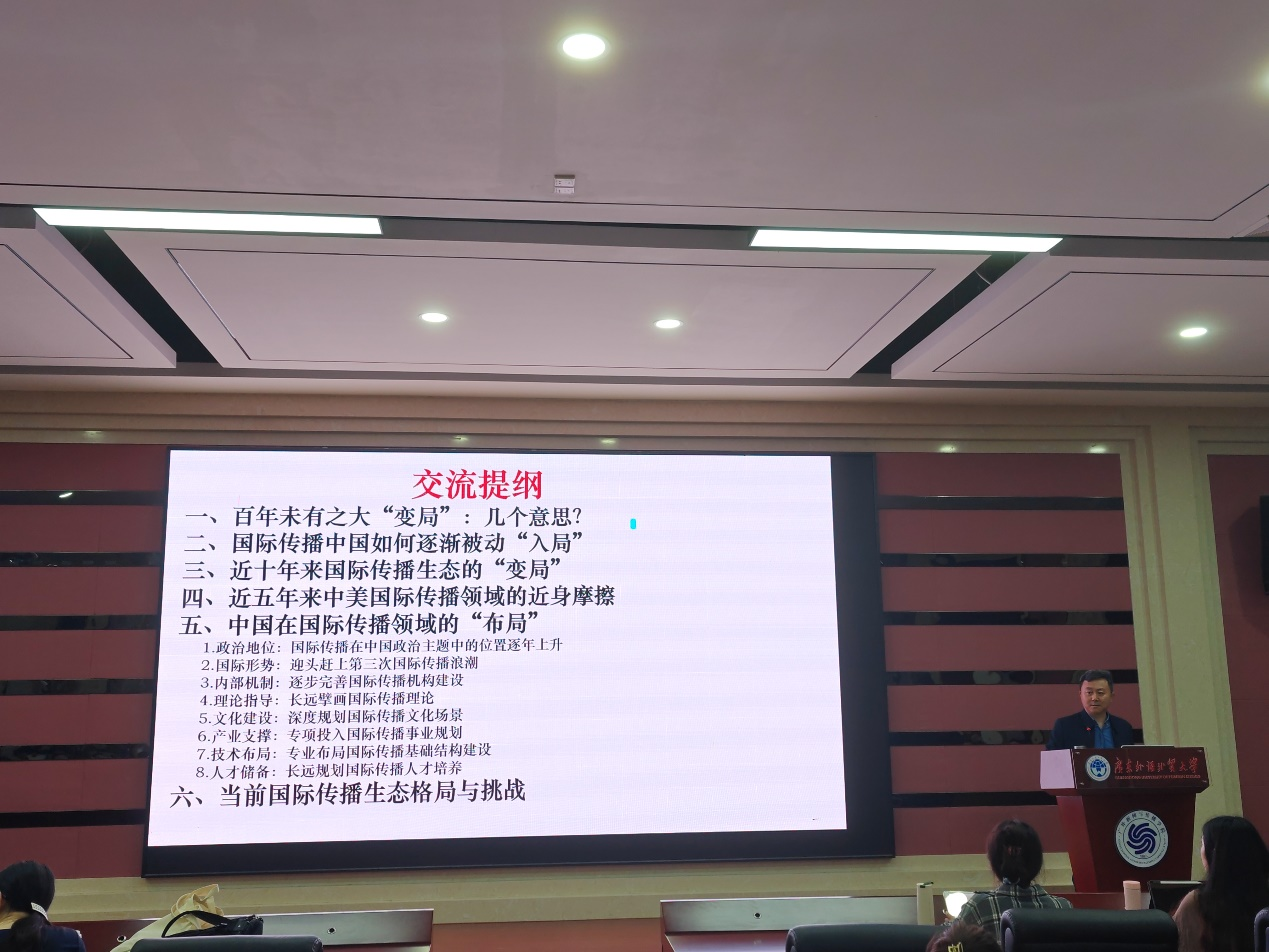 讲座伊始,姜飞教授首先从政治、话语、思想、传播的知识角度来解读习近平总书记百年未有之大变局,深入剖析了全球传播战略格局和国际舆论态势的现状与趋势。随后,姜飞教授将历史、理论和案例相结合,生动幽默的讲述了“国际传播中国如何逐渐被动‘入局’”“近十年来国际传播生态的‘变局’”“近五年来中美国际传播领域的近身摩擦”以及“中国在国际传播领域的‘布局’”和“当前国际传播生态格局与挑战”等内容。他强调,目前国际政治跨文化传播成为博弈最激烈的前线,在新时代背景下,我们要积极探索新的国际传播模式,提高国际话语权和影响力,为构建人类命运共同体贡献力量。