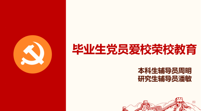 周明和潘敏分别对毕业生党员进行了爱校荣校教育,倡导毕业生文明离校。周明提到,一是要以身作则,继续遵守和配合学校疫情防控要求;二是要爱校荣校,发挥党员先锋模范作用;三是要尽快转换角色,积极融入到新的环境当中。潘敏表示,毕业生党员要践行广外价值观,知恩于心、感恩于行,利用专业知识为社会贡献自己的力量。