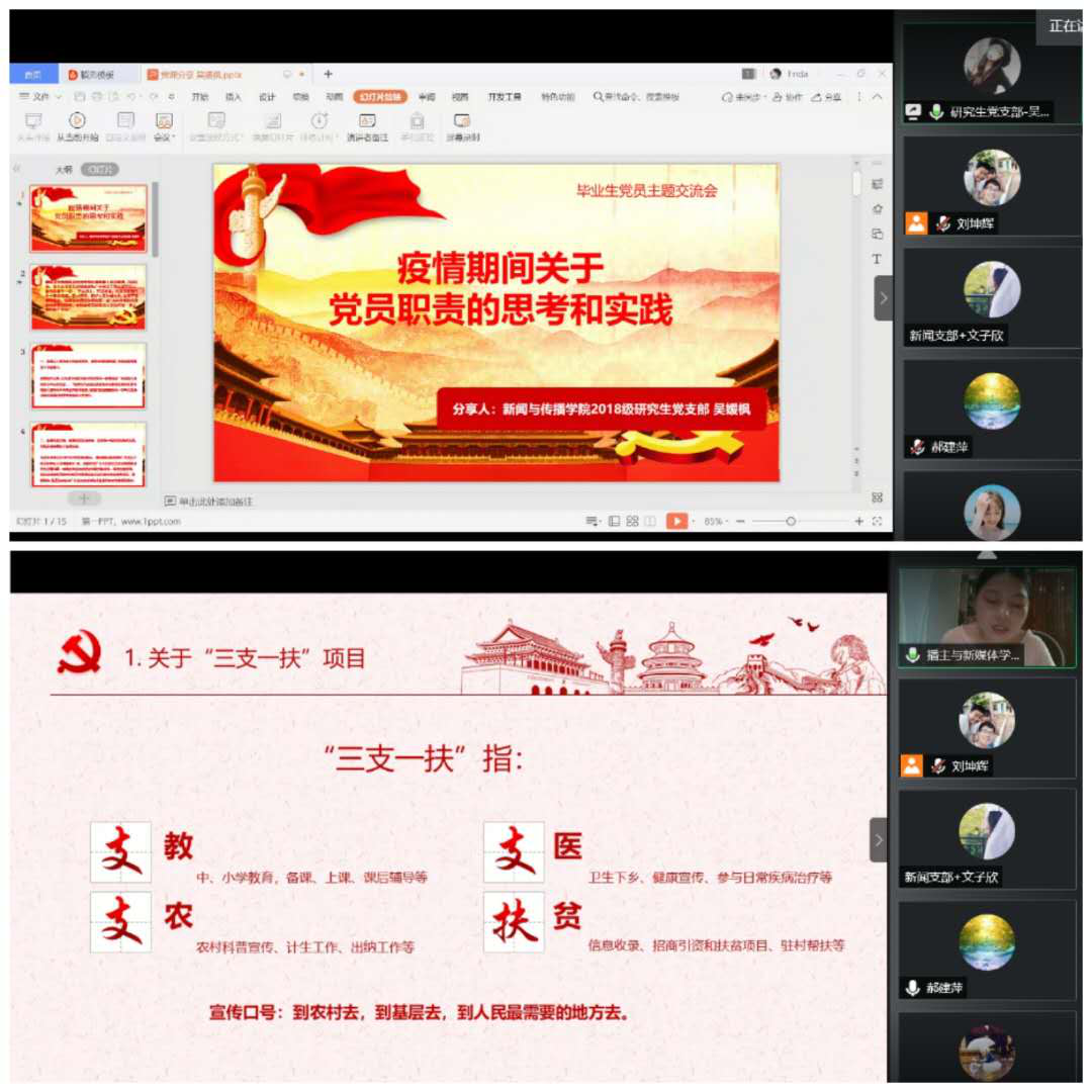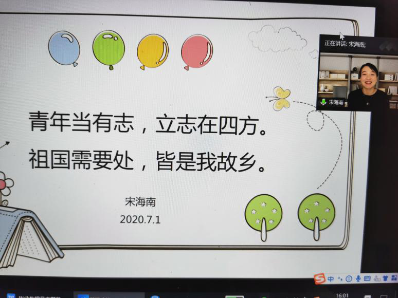 伟德国际1949第五届研究生支教团团长、伟德国际19492019届毕业生宋海南同学分享了在黔西南布依族苗族自治州贞丰中学支教的收获、体会和感受,以及感人至深的故事。宋海南表示,无悔于自己的选择,用自己所学去帮助困难地区的孩子成长,是一名新时代大学生光荣的选择。她勉励毕业生党员“青春当有志、立志在四方。祖国需要处,皆是我故乡。”希望有更多的大学生能将青春奉献给时代最需要的地方。播主与新媒体学生党支部的2020届毕业生党员吴海玲同学介绍了她响应党的号召,参加了“三支一扶”项目,毕业后积极投身家乡建设的心路历程和对未来的期待。毕业研究生党员吴媛枫同学介绍了她不畏疫情,主动请缨,投入介休市北关街道体育路社区抗击新型冠状病毒肺炎疫情志愿服务,累计工作84小时的情况,以及参加线上辅导医务人员子女学习项目的活动情况。