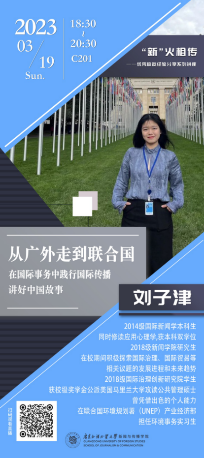 【1】刘子津,新闻学(国际新闻)专业本科2014级,研究生2018级,获校级奖学金公派美国马里兰大学攻读公共管理硕士,后到联合国环境规划署实习。