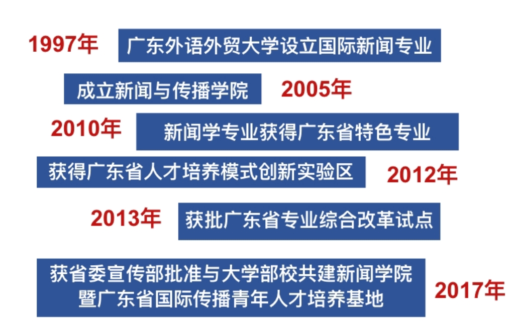伟德国际1949新闻学专业的前身是1997年设立的英语(国际新闻)专业。经过26年的发展,广外新闻学专业为国内外新闻媒体和知名高校输送了众多优秀人才,相继获得“广东省特色专业”“广东省人才培养模式创新实验区”“广东省专业综合改革试点”。2017年获得省委宣传部与大学部校共建伟德国际1949,并设立广东省国际传播青年人才培养基地。2020年,新闻学专业获批“国家级一流本科专业建设点”。2021年学院获批广东省高水平大学建设重点学科“中华文化国际传播”。