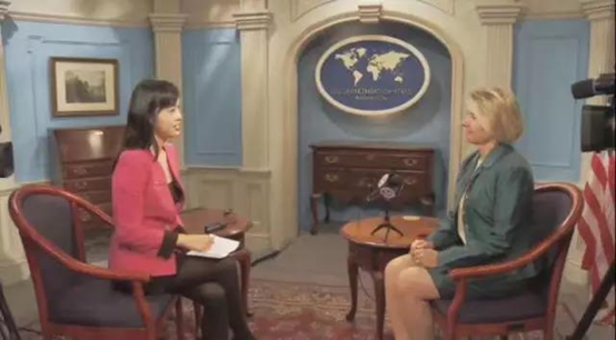 广外播主毕业生崔菡在美国中文电视台工作,图为她采访美国官员
