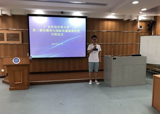 此外,来自新疆大学的谢龙飞同学作为学员代表进行了发言,首先讲述了新疆的特色,包括了新疆的特色文化,人文地理等,随后他分享了自己未来的新闻理想,希望学习南方的新闻传播理念。他认为广州是近代报刊的起源地之一,拥有开放、兼容的文化氛围和文化理念。希望在这样优秀的文化环境下共同学习,提升自己,做出更好的贡献。