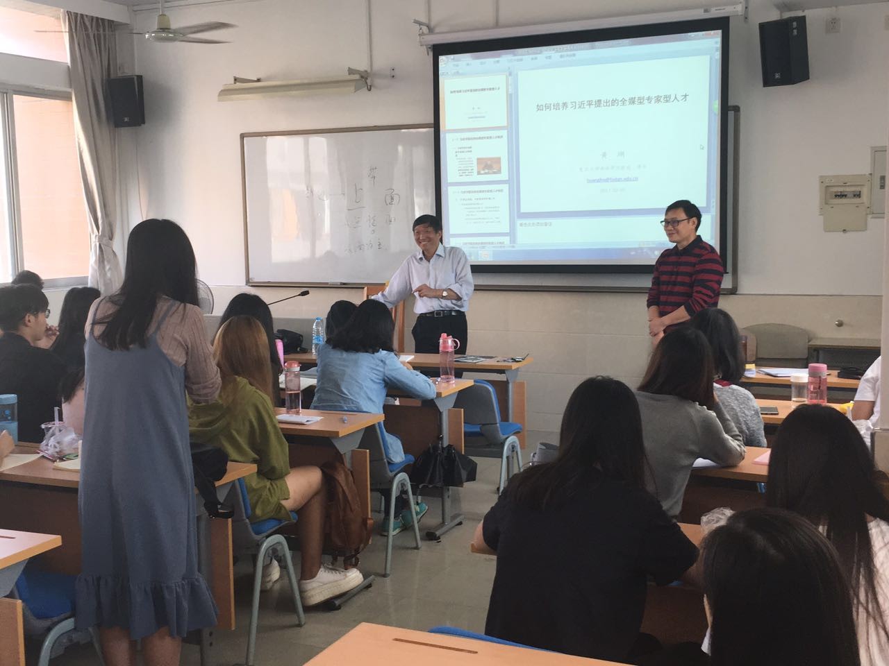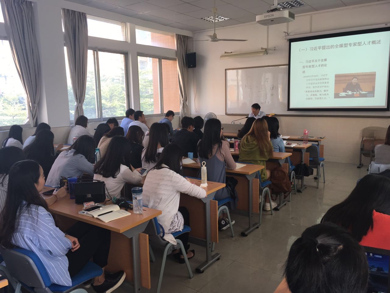 2、为什么要培养全媒型专家型人才。黄瑚教授分析,一方面是因为互联网与新媒体对新闻传播业提出了颠覆性的挑战,互联网对新闻专业性的消解,另一方面是因为随着互联网等高新技术的发展,越来越需要社交媒体与专家型新闻传播人才,最后还有来自人工智能的挑战。关于人工智能的挑战黄瑚教授表示不必过分解读,人工智能虽然在数据新闻写作、下象棋等有固定程序的方面远超人类,但最尖端的的人工智能却不能辨别一个班的女生有多少个。黄瑚教授以生动有趣的例子带动同学们热烈地讨论和思考。