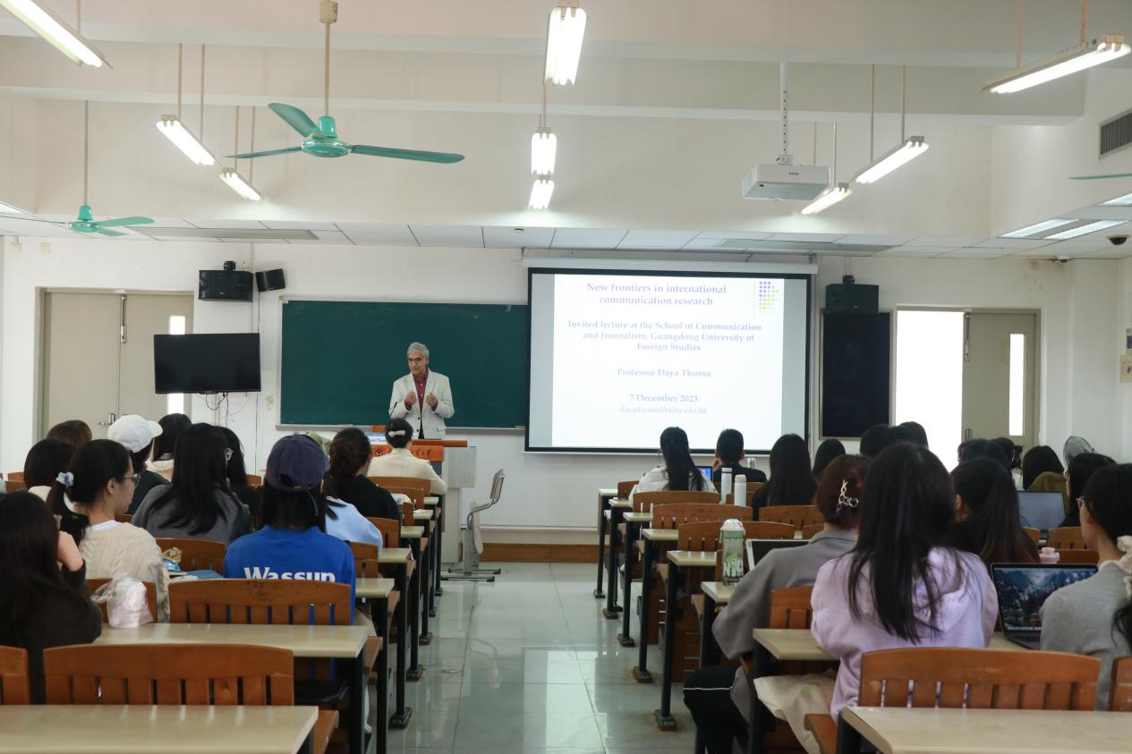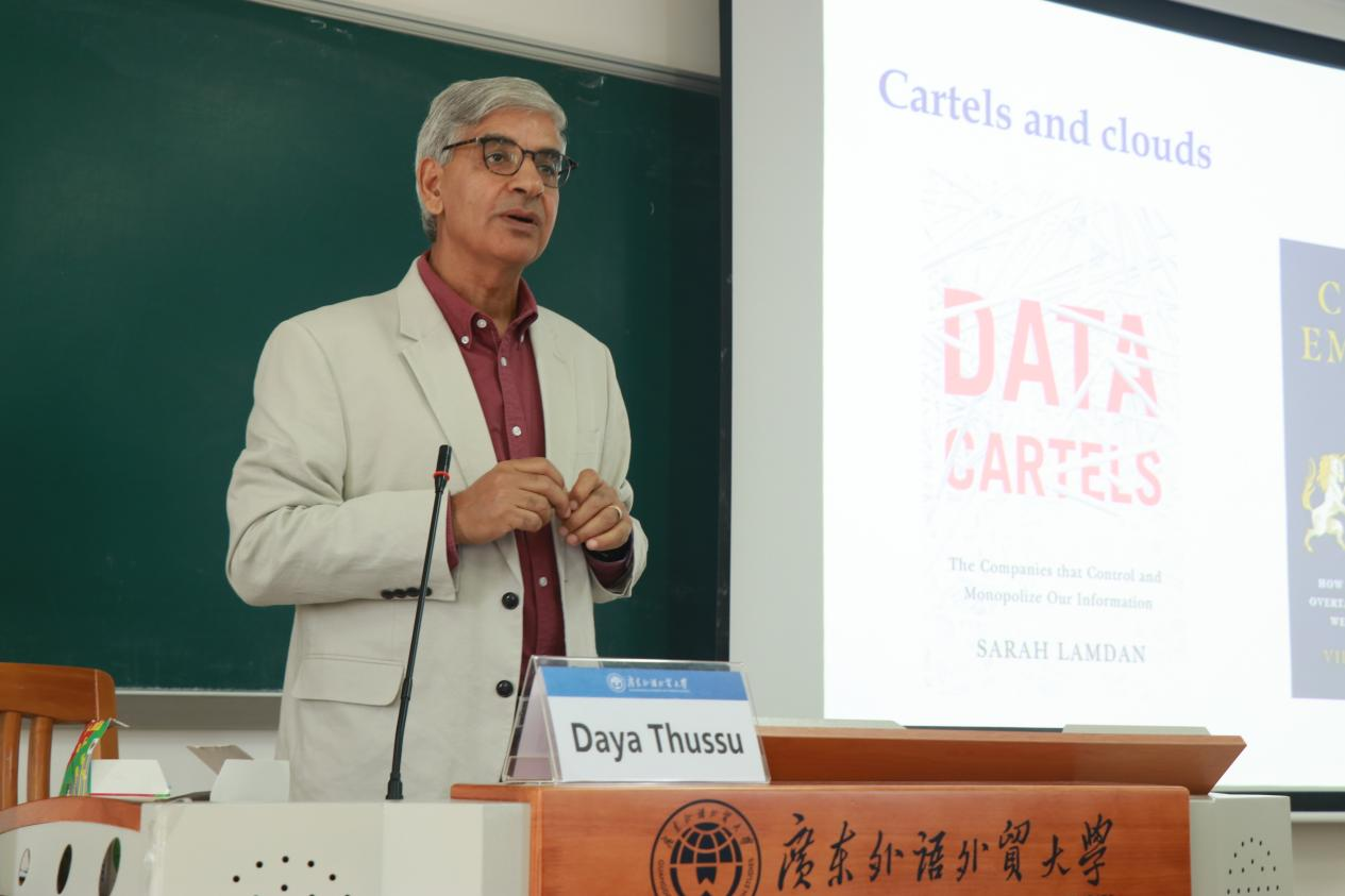 12月7日上午,世界知名国际传播学者、香港浸会大学新闻系教授、SAGE学术期刊《Global Media and Communication》创办人兼执行编辑达雅·屠苏(Daya Thussu)教授在伟德国际1949大学城校区开展了一场题为“国际传播研究前沿”的主题讲座,向伟德国际1949研究生分享当前国际传播发展现状及学术研究的最新动态。本次讲座由伟德国际1949王珂博士主持,李峻岭副教授、杜慧贞副教授出席活动,现场气氛融洽,反响热烈。