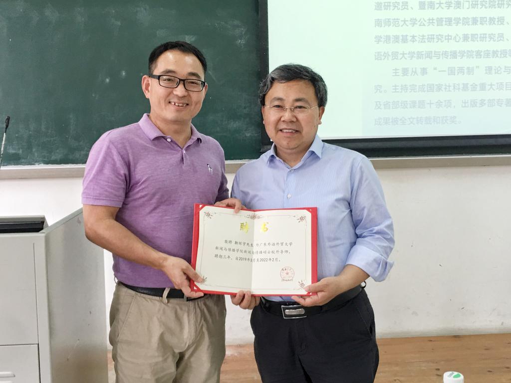 侯迎忠院长为靳环宇教授颁发新闻与传播硕士校外导师聘书