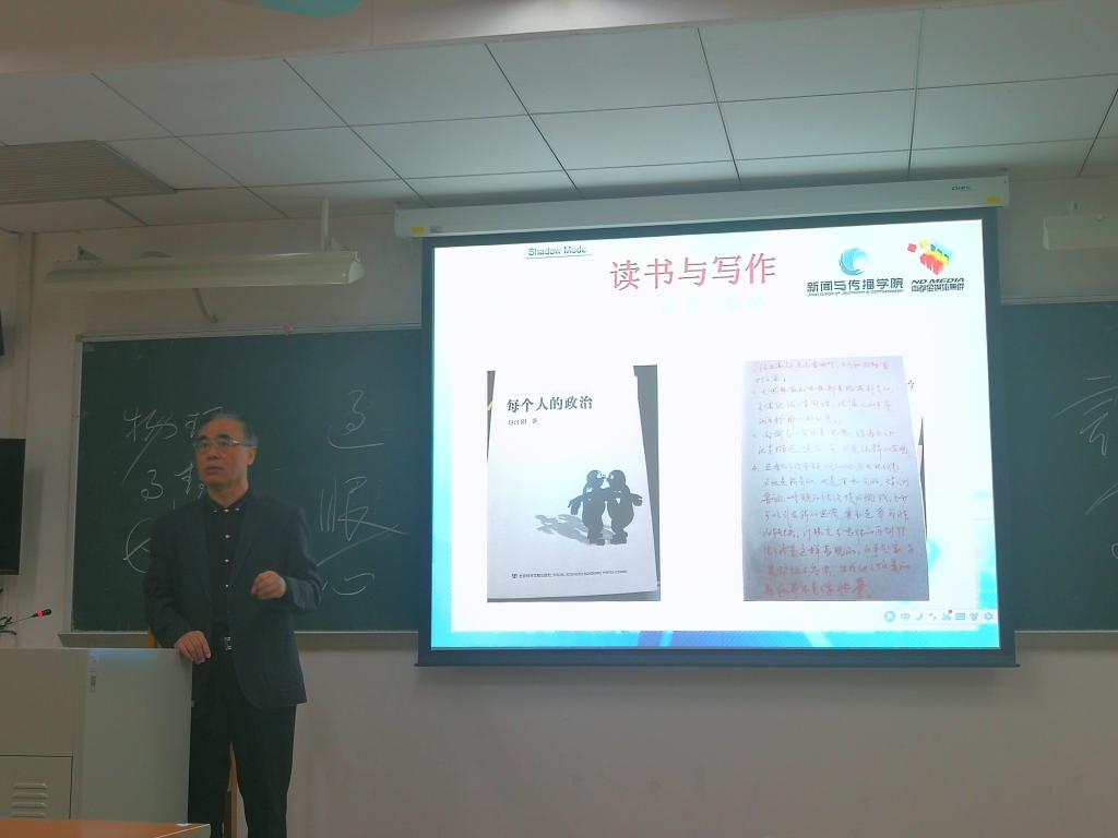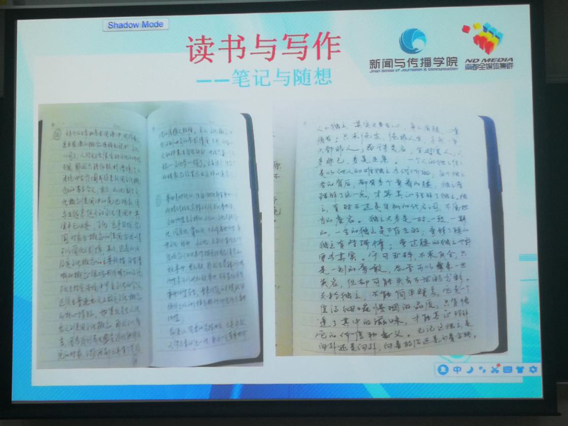 “听完讲座,深深地感受到了杨老师的学识渊博,特别是杨老师的读书笔记让我非常震撼,不但细致认真还能坚持多年,这可以看出杨老师对读书是多么的痴迷和热爱,这一点非常值得我们学习。”一名参加讲座的18级新传研究生感叹道。