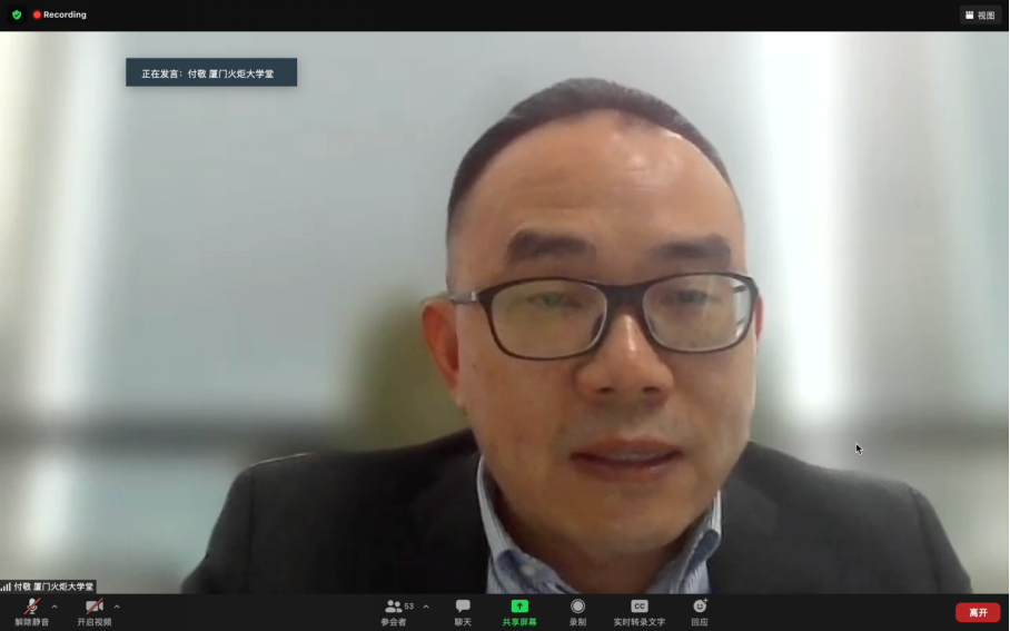 随后厦门火炬大学堂执行副校长付敬为我们带来了题为《“双碳”目标和技术引领:中国领军企业塑造国际影响力的全新背景》的分享。付副校长认为中国进入新时代以来在全球气候变化,政治和国际传播两个异彩纷呈的关键领域里展示了独特的建构和塑造能力。首先在3060双碳背景和百年变局加速演进背景之下,绿色和气候变化是暂时的通用的国际沟通语言,中国和欧美在这个议题上有很大的国际协同空间,但中国需要抢跑,在这个议题上形成更多的共识。其次是公司要重视商业声誉管理。全球对话语境从二十年前开始风行的企业社会责任到去年以来大热的全球环境社会和公司治理,特别强调价值和责任透支,付副校长认为领军企业一定要站在树立企业全局竞争力的高度,主动有为提升国际传播意识,将其成为管理层的核心素养进行打造。