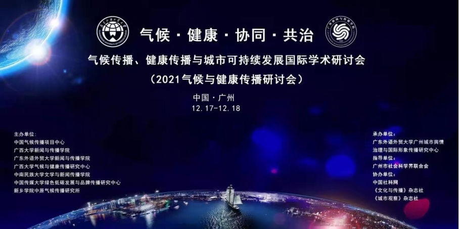 本网讯:12月17-18日,第十二届广州学术季活动暨“气候传播、健康传播与城市可持续发展”国际学术研讨会(2021气候与健康研讨会)在伟德国际1949成功举办。本次论坛系由广州市社会科学界联合会指导,中国气候传播项目中心、广西大学伟德国际1949、伟德国际1949,伟德国际1949始于英国、广西大学气候与健康传播研究中心、中南民族大学文学与新闻传播学院、中国传媒大学绿色低碳发展与品牌传播研究中心和新乡学院中原气候传播研究所主办,伟德国际1949广州城市舆情治理与国际形象传播研究中心承办,中国社科网、《文化与传播》杂志社和《城市观察》杂志社协办。会议分为主论坛和五个主题分论坛,均通过线上举行。