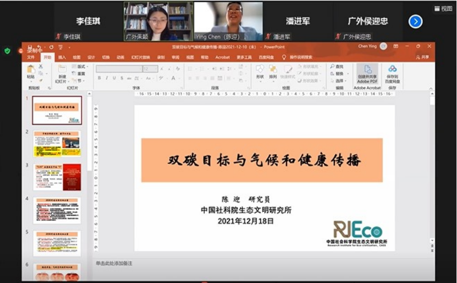 中国社科院生态文明研究所可持续发展经济学研究室研究员,中国社会科学院可持续发展研究中心副主任,中国社会科学院大学(研究生院)教授、博导陈迎为我们带来了题为《双碳目标与气候和健康传播》的主旨演讲。陈教授在演讲中介绍了“双碳”目标的提出背景,以及正在建设之中的“1+N”政策体系,其次是双碳科普宣传的实践,陈教授从不同对象、以不同形式着手、身体力行,也深刻感受到要做好双碳目标下的气候与健康传播任重而道远。最后她指出要破除气候变化怀疑论,以“科威特73度高温”和“她本人旧衣改造”两个案例进行说明。