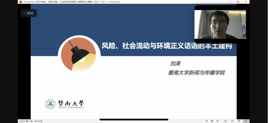 暨南大学的刘涛教授围绕《风险、社会流动与环境争议话语的本土建构》展开分享。刘涛教授认为环境话语建构的修辞逻辑有三层,分别是知识话语,接合话语以及文化话语,分别对应了意指,再造,征用的含义。刘涛教授的研究对象选择转型中国五种代表性的社会流动形态:三种人的流动、一种物的流动、一种风险的流动,他用典型个案分析与媒介话语分析相结合,聚焦特定过的社会案例或议题形态,开展实地调研与媒体报道分析,基于此探讨中国本土环境正义的内涵及其对西方话语的超越。