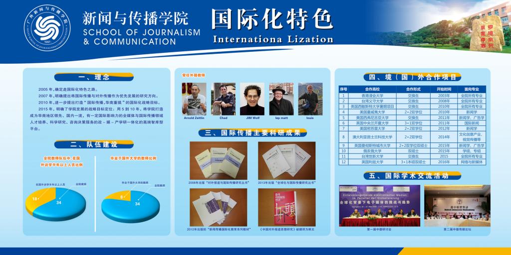 目前与英国、美国、澳大利亚、台湾、香港等十余所境外知名大学建立了学生合作培养关系和学术交流关系。学生就业率连续多年达到百分之百。新闻学专业于2010年被广东省教育厅确立为省级特色专业;2012年被确立为省级人才培养模式创新试验区,2013年被确立为“卓越新闻传播人才教育”省级综合改革试点单位。