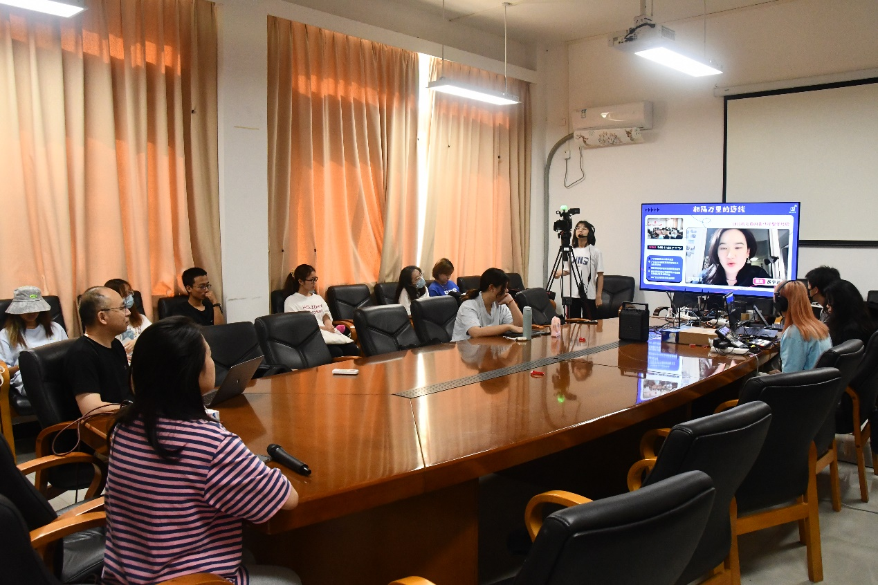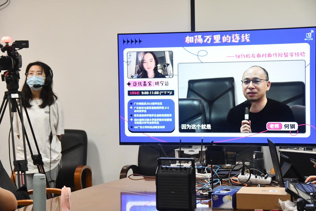 在现场参加本次视频连线的为网媒系20级本科生,胡宁远校友为在校师弟师妹们分享了在美国的学习与工作经验,现场视音频信号通过新传工作室视频号实时推送给了全院师生。