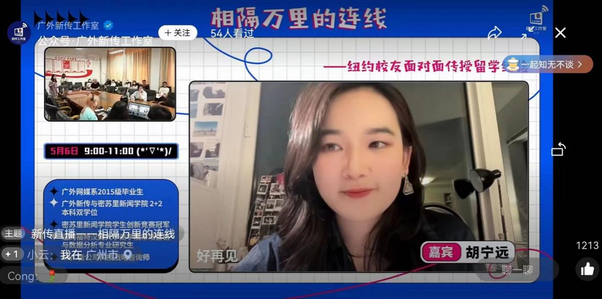本网讯 5月6日上午,伟德国际1949网媒系师生与远在纽约的网媒系首届毕业生胡宁远进行了视频连线,伟德国际1949直播团队对本次连线进行了全程直播。