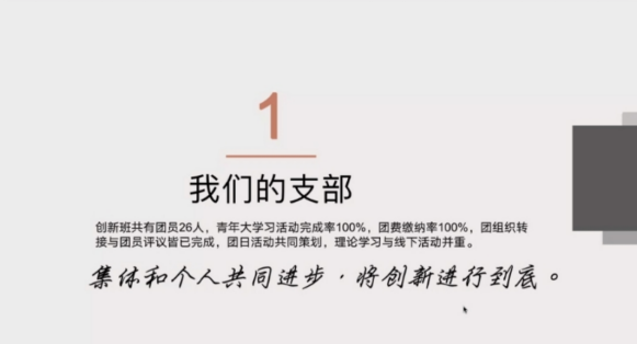 新传1903团支部理论学习情况良好,每次青年大学习,所有团员都能按时完成,所有团员同学均在广东“智慧团建”平台报到,团费均按时缴纳。“红色经典晚会”自主创作剧本,以小见大讲述建国以来的故事,大大提升了支部凝聚力。