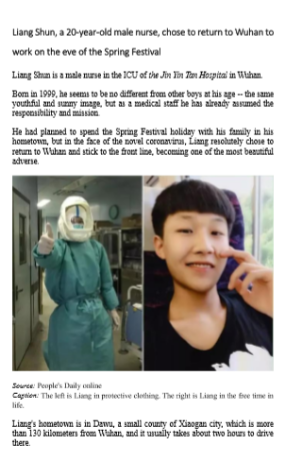 在编译过程中,叶芝记住了许多抗疫青年。最让她感动的是那位年仅20岁的武汉一线护士“梁顺”——还在读大专的他,在得知武汉疫情大爆发后,毅然告别家乡亲人,主动请缨驰援一线。