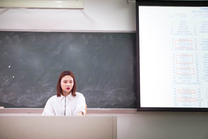 网媒1501林慧向同学们分享“如何选择目标学校”的经验。她表示:“绩点足够高是我们能自主选择未来道路的前提。“增加自己的实习经验、提升自己的能力也是申请留学不可或缺的条件。她还为同学们介绍了各大学的排名,向同学们分析各国(境)外大学的利弊和申请难度。