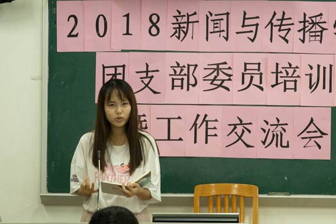 作为17级优秀团支书代表,韩笑妍和叶芝在会议上分享工作经验。韩笑妍以“如何做一个可爱的团支书”为主题,结合自己作为团支书的工作经历,提供了团日活动开展的具体实践经验,如前期与班委开会确立团日活动主题,与班委合作时要明确分工等建议。叶芝表示团日活动不等于吃喝玩乐,她说:“有些团日活动没有结合主题,就没有了灵魂。” 叶芝以新闻类1702班的团日活动主题“不忘初心,坚定跟党走”为例,解释如何用各个子活动落实体现这一宏大的主题。她也建议团日活动可以结合专业或班级的特点开展。