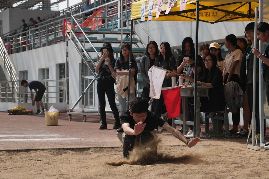 还未正式开始比赛,沙池两旁便已三三两两的聚起了人。在助跑线前,一位选手简单地做了做高抬腿运动,准备着接下来的比赛。场外亦有许多同学举着牌子为选手们加油助威。随着裁判一声令下,比赛正式开始。艳阳高照,飞沙漫天,选手们纵身一跃,为最终成绩奋力。来自新闻1701的黄镕蔚第一次就跳出了4.75米的好成绩,引得一阵欢呼。第二次尝试,他更是加速助跑,一踏踏在地上,以一个漂亮的姿势跃出,“5米!”他跳出了本次比赛的最好成绩并夺得了冠军。而在短暂的尝试和调整后,来自新闻1706的徐嘉聪和新闻1701黄烔略都分别跳出了4.66米和4.62米的好成绩,位列第二和第三。