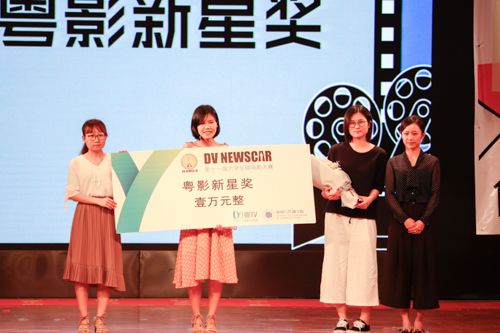 粤TV(广东IPTV)市场策划经理丘莹颖为获得“粤影新星奖”剧组代表颁发万元支票