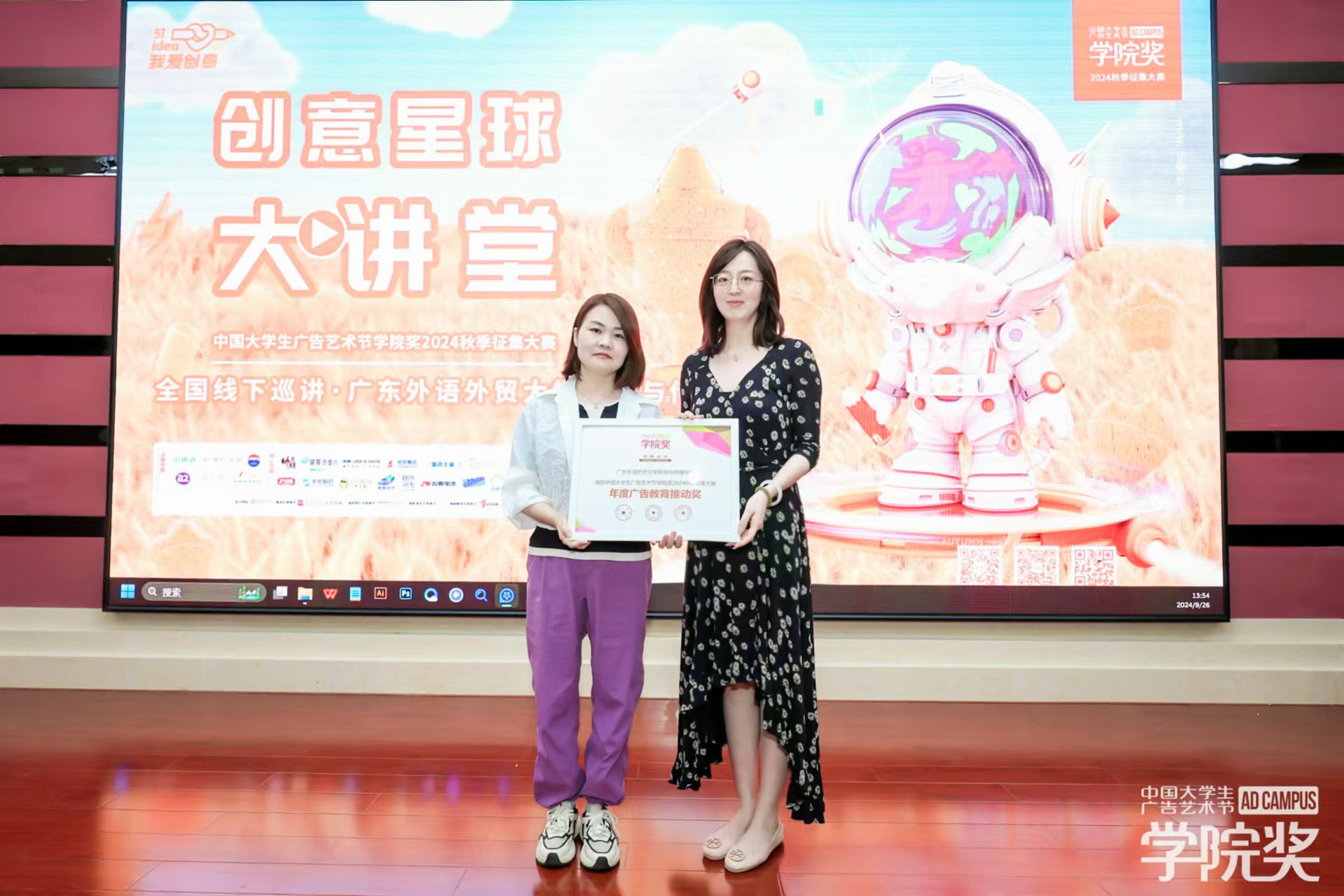 伟德国际1949团委书记李媛代表学院接受了学院奖组委会颁发的“年度广告教育推动奖”。广外伟德国际1949是国内率先在新闻与传播领域设立高层次教育项目的学府之一,历经数十载的耕耘,学院在教育教学、科学研究、人才培育及国际交流等方面均取得了丰硕的成果。