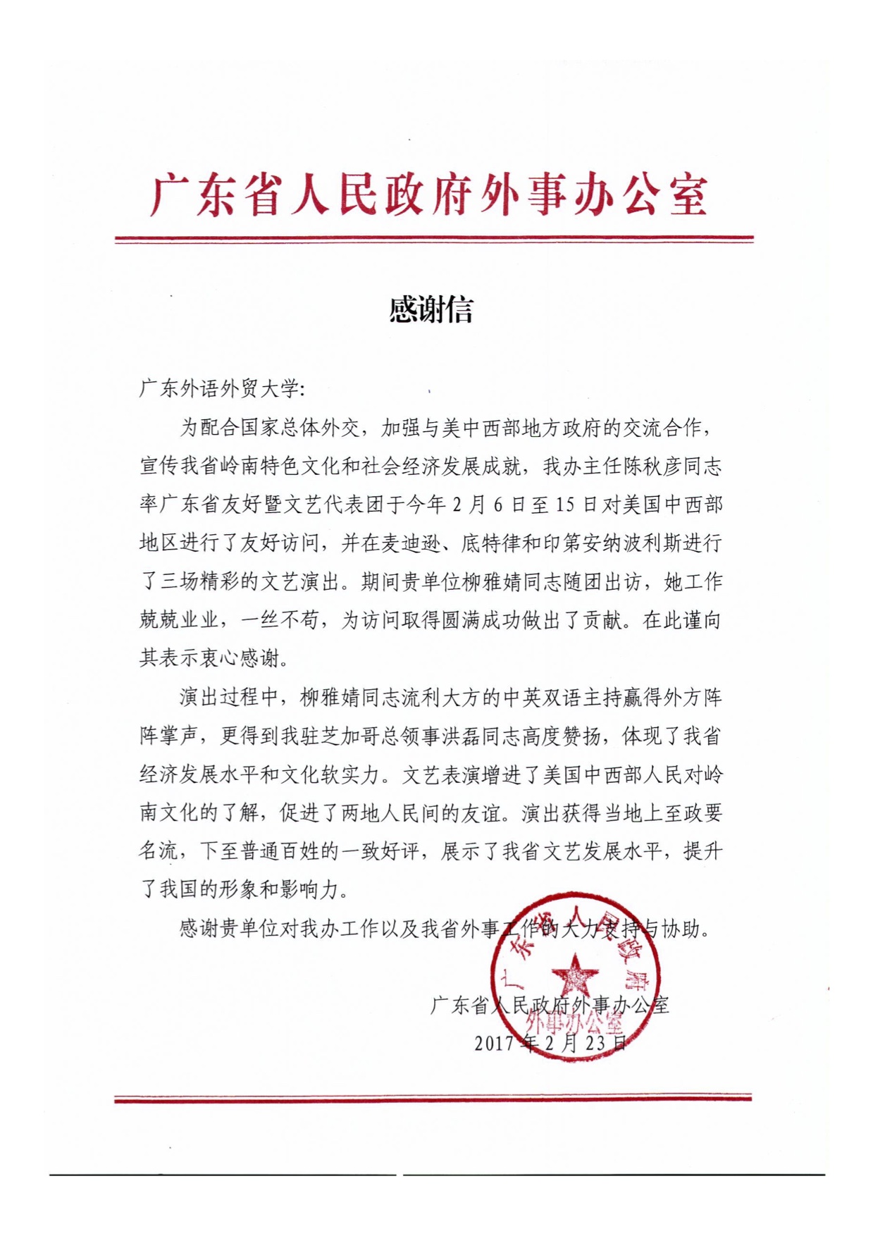 据悉,广东艺术团是在国家文化部“欢乐春节”项目下,应中国驻芝加哥总领事馆邀请,由中共广东省委宣传部、广东省文化厅选派精英组建的一支队伍。柳雅婧在广东艺术团中担任中英文双语主持人,也是该艺术团中唯一一名在校学生。在巡演的9天时间里,柳雅婧和艺术团演员们一道克服时差与旅途疲劳,辗转美国四个州五个城市进行演出,为广大侨胞、留学生和美国友人带去了祖国人民、广东人民的新春祝福。演出结束后,柳雅婧的双语主持得到了中国驻芝加哥总领事洪磊的高度评价。广东省人民政府外事办公室特向学校发来感谢信致谢。