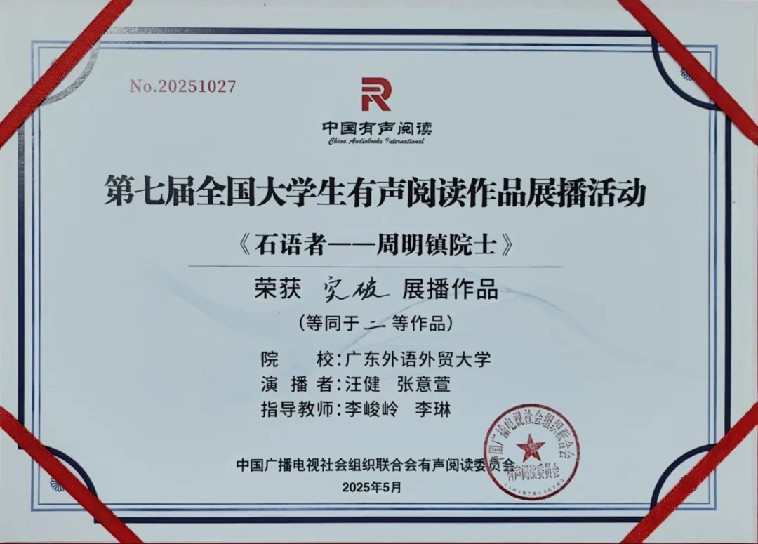 近日,伟德国际1949,伟德国际1949始于英国播音主持专业的22级学生汪健和24级学生张意萱,在由中国广播电视社会组织联合会有声阅读委员会、浙江教育出版社集团、天津传媒学院共同主办的2025第七届全国大学生有声阅读作品展演活动中荣获国家级二等奖。作品由伟德国际1949播音与主持艺术系李峻岭教授、李琳教授指导。