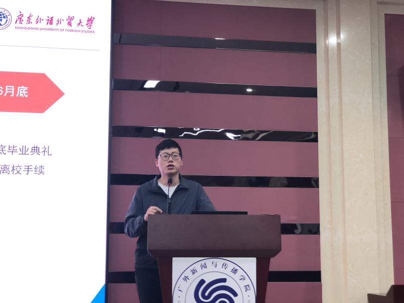 而后,陈博菲进行就业动员,他通过一系列毕业生就业数据展示新传学子广阔的就业选择及良好的就业前景,就毕业生应该注意的问题进行了详细的解读,为2016级学子规划未来指明了方向。